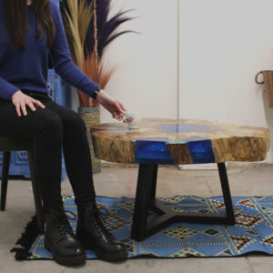 Vibrant sky blue resin fills the natural gaps in the wood, creating a stunning contrast that adds energy and uniqueness to every piece. With its bold, artistic top and sturdy metal legs, this table perfectly balances rustic charm and modern elegance.
