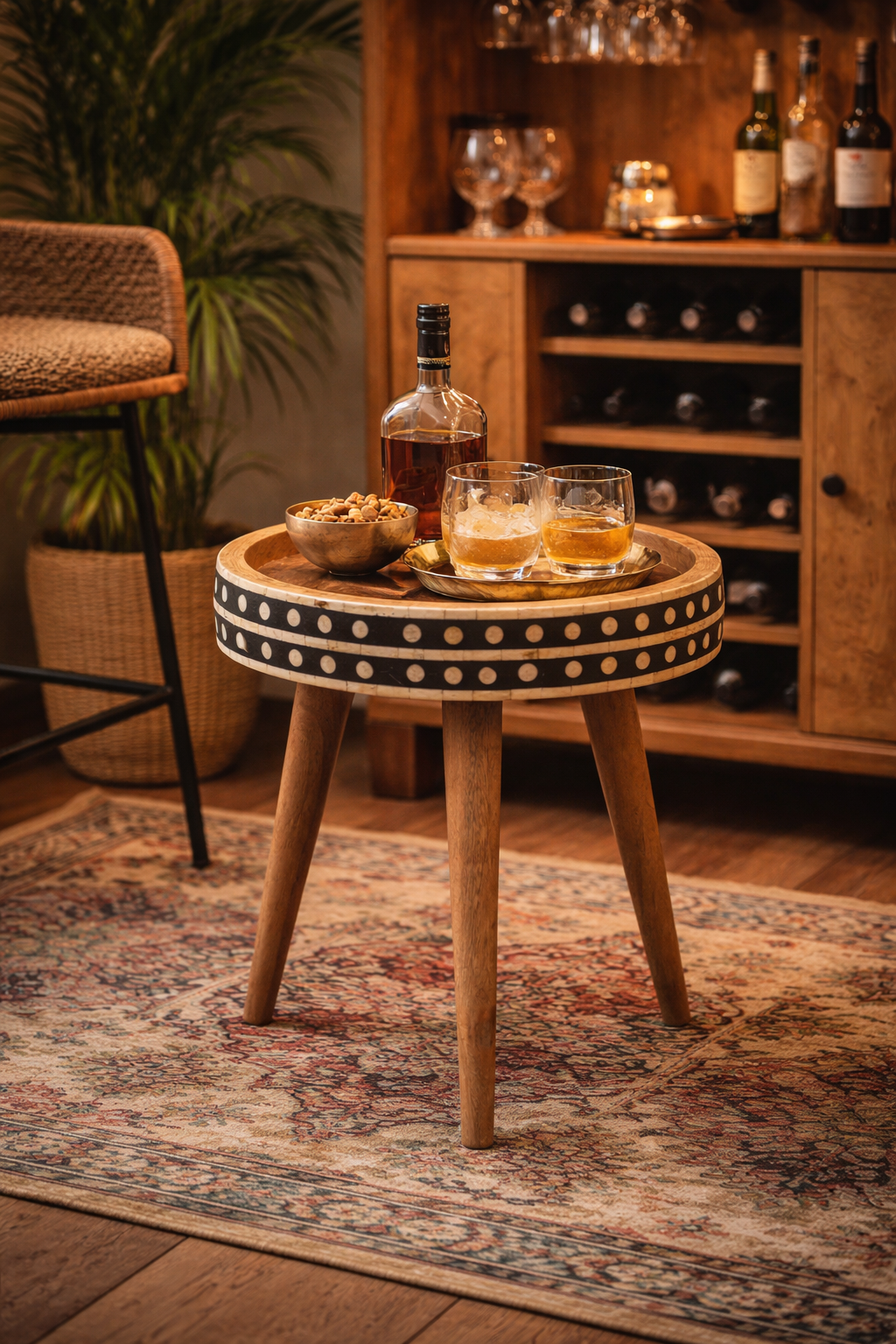 The circular tabletop is finished with a distinctive black and white bone inlay border, carefully hand-applied using responsibly sourced bone from naturally deceased animals such as camels, goats, and buffaloes. Each piece is individually crafted, resulting in subtle variations in grain, tone, and pattern that make every table truly unique.