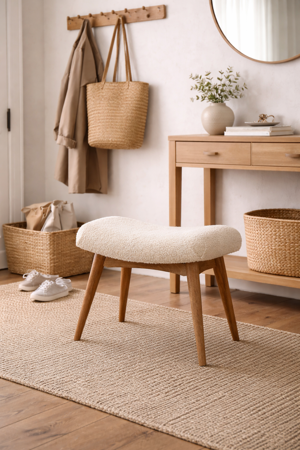 The bench stands on four Nordic-style legs, expertly crafted from 100% solid mango wood and finished in a warm oak tone. This combination of natural wood and textured upholstery creates a balanced, timeless look that suits hallways, bedrooms, living rooms or dressing areas.