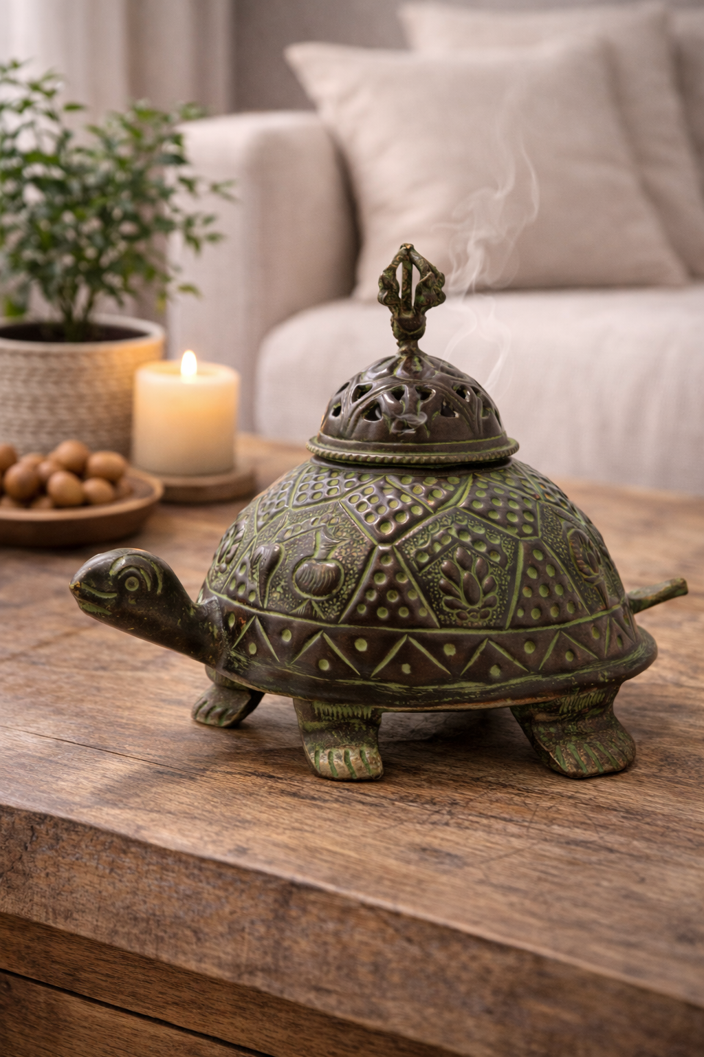 Invite harmony, longevity, and timeless beauty into your space with our Brass Verdigris Tibetan Turtle Incense Holder. Handcrafted in India by skilled artisans, this striking piece features a majestic turtle design, a revered symbol of wisdom, stability, and long life in Tibetan and Eastern traditions.
