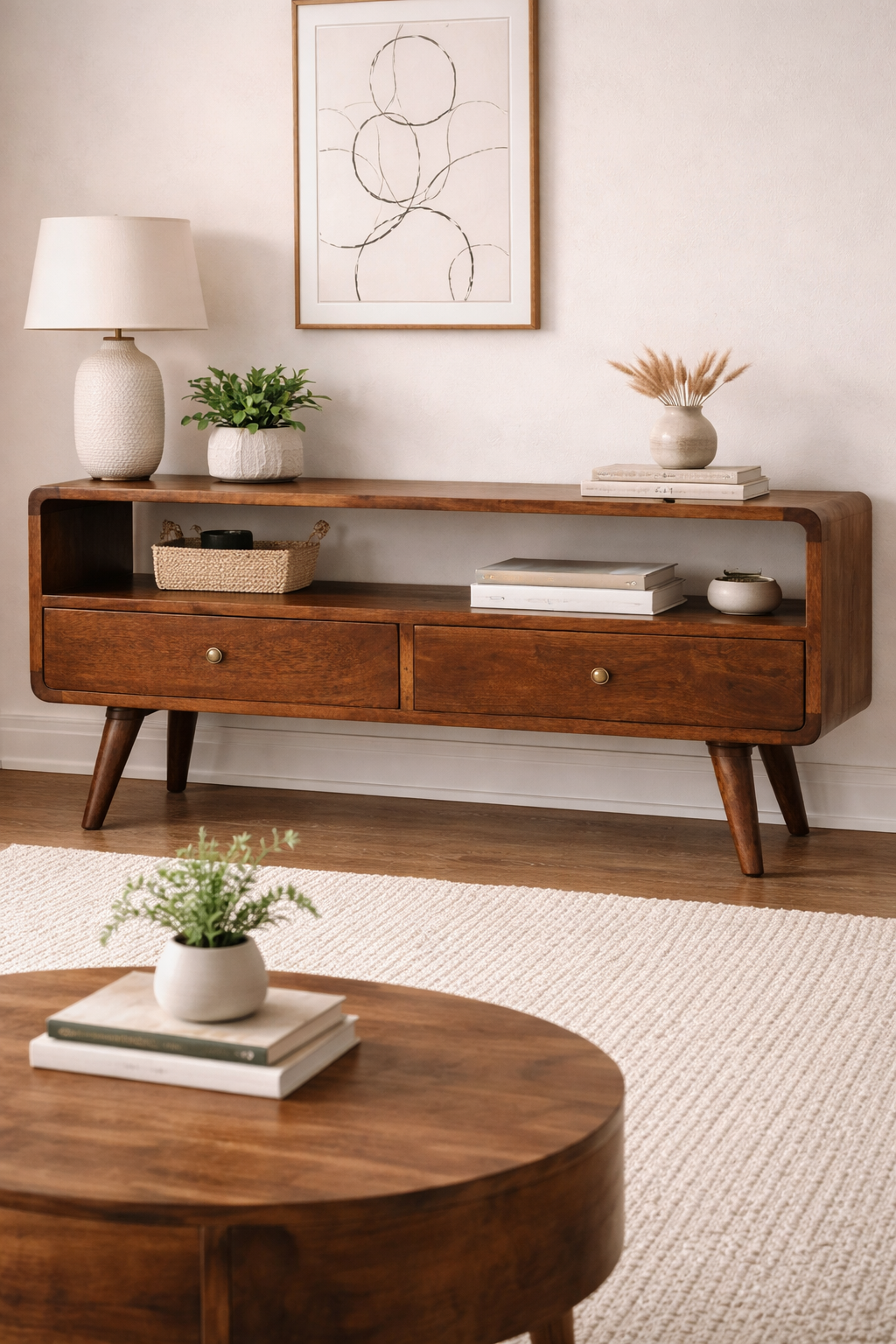 Designed with smooth curved edges, this unit keeps things simple and contemporary while still standing out. It features two spacious drawers with metal knobs for hidden storage, alongside a large open shelf—ideal for media boxes, books or decorative pieces.
