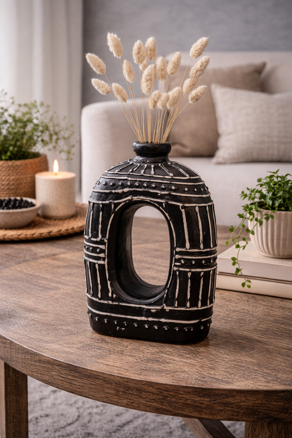 At 30cm tall, this is a true statement piece. It works best as a focal point—on coffee tables, sideboards, consoles or shelving—where the shape can do the heavy lifting. Whether styled with dried stems or left empty, it brings structure and balance to your décor.