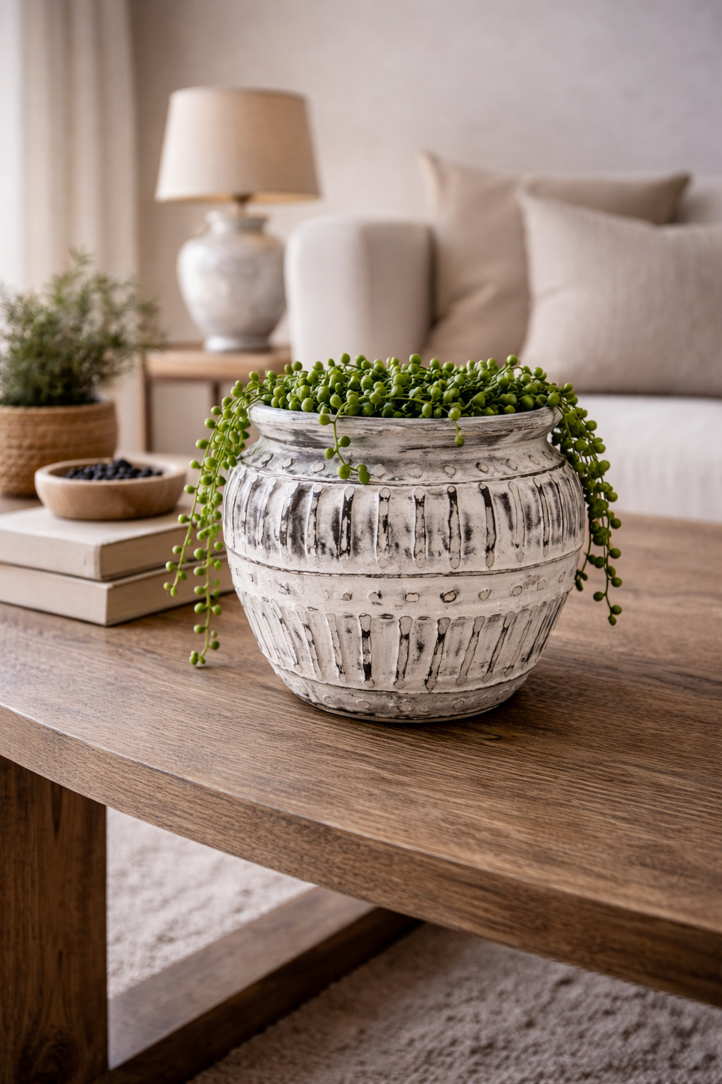 A small handcrafted cream terracotta plant pot with Greek-inspired detailing, perfect for styling shelves, desks and windowsills.