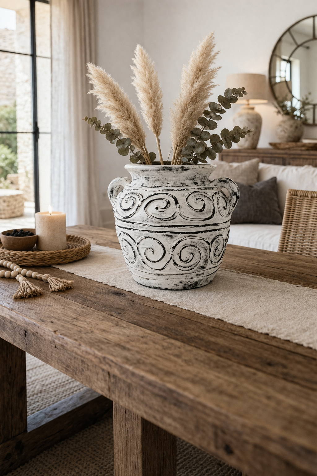 At 15cm, it’s the ideal size for shelves, windowsills, side tables or grouped styling. The classical Greek-inspired shape and subtle swirl detailing give it structure, while the soft cream finish keeps it easy to work into modern interiors.