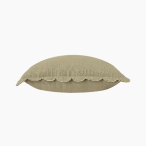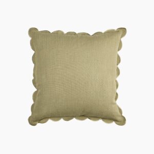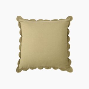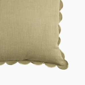 Elise’s cushion whispers of coastal breezes. The olive green front canvas, crafted from a blend of cotton, polyester, and linen, exudes warmth, while the linen back ensures a refined finish. Its scalloped edges and delicate embroidery add texture, blending into both contemporary and coastal interiors. A perfect choice for those seeking to infuse a subtle touch of luxury into their space.