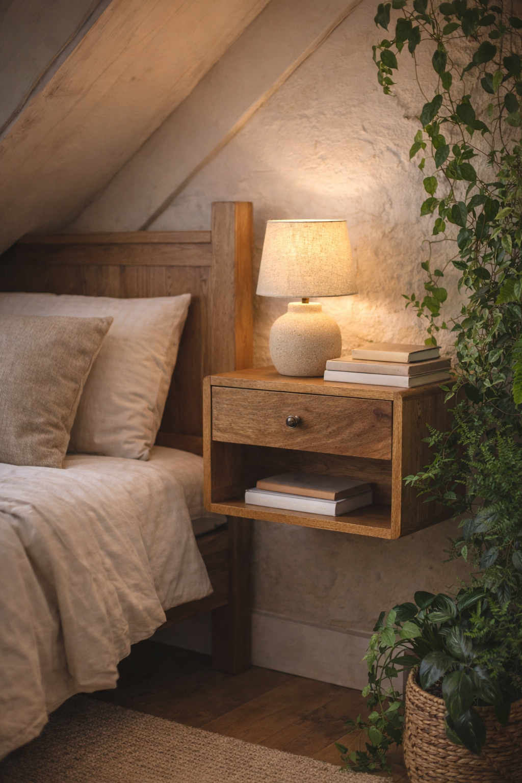 Bring timeless character and practical storage to your bedroom with the Floating Mini Classic Side Table. Designed to blend Mid-Century charm with subtle Art Deco influences, this compact wall-mounted bedside table is handcrafted from 100% solid mango wood in a warm oak-style finish.