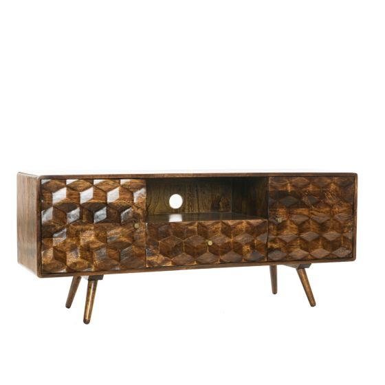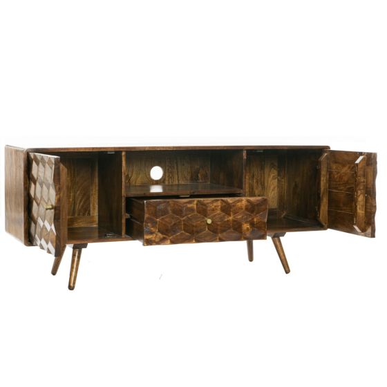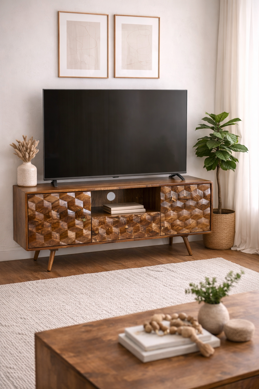 Solid mango wood 145cm media unit with geometric carved doors and practical storage—built for style and everyday use.