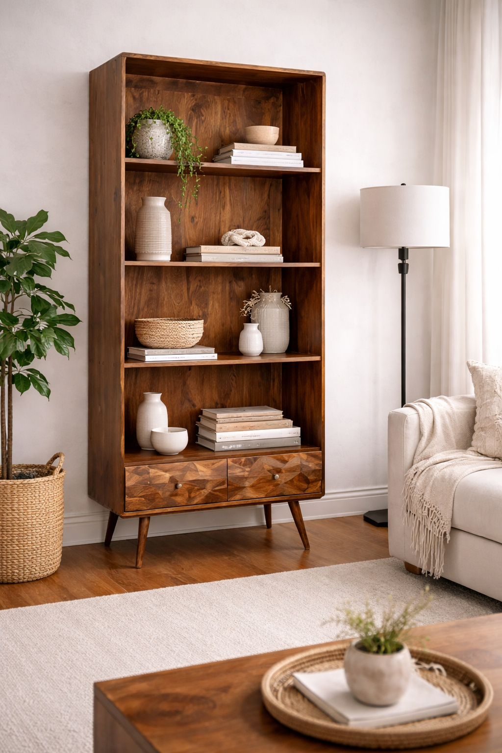 Geo Mango 85cm Bookcase – Solid Wood Shelving Unit with Geometric Drawers