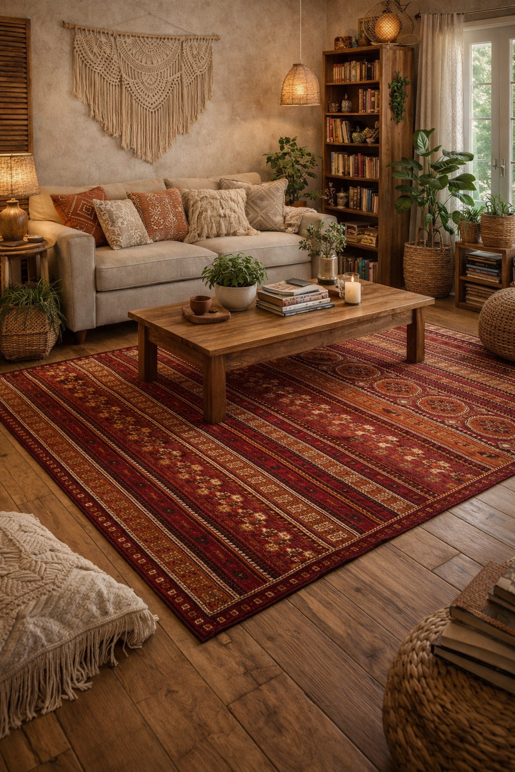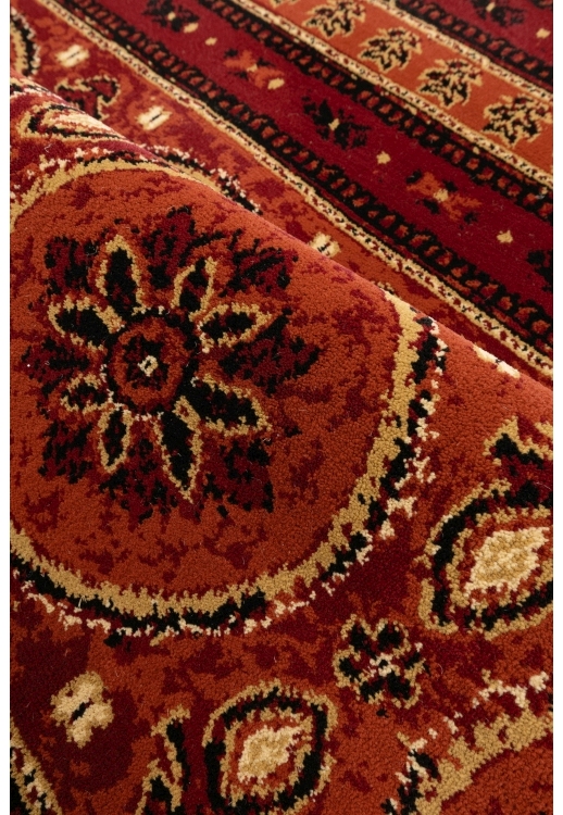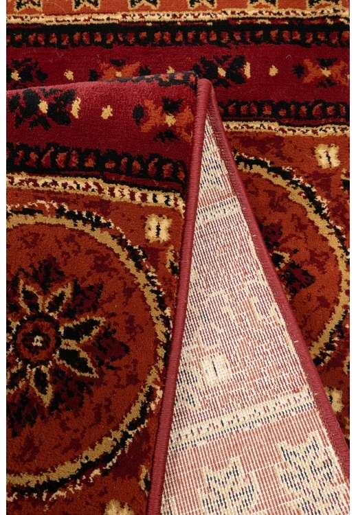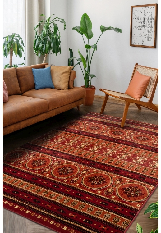 A tribal terracotta rug with rich patterning and a soft 8mm pile, machine woven for durability and comfort in boho and rustic interiors.
