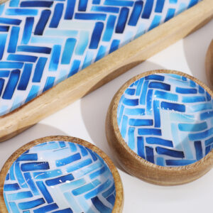 Handcrafted Mango Wood Bowl Set with Blue Stripe Enamel – 3 Bowls with Tray