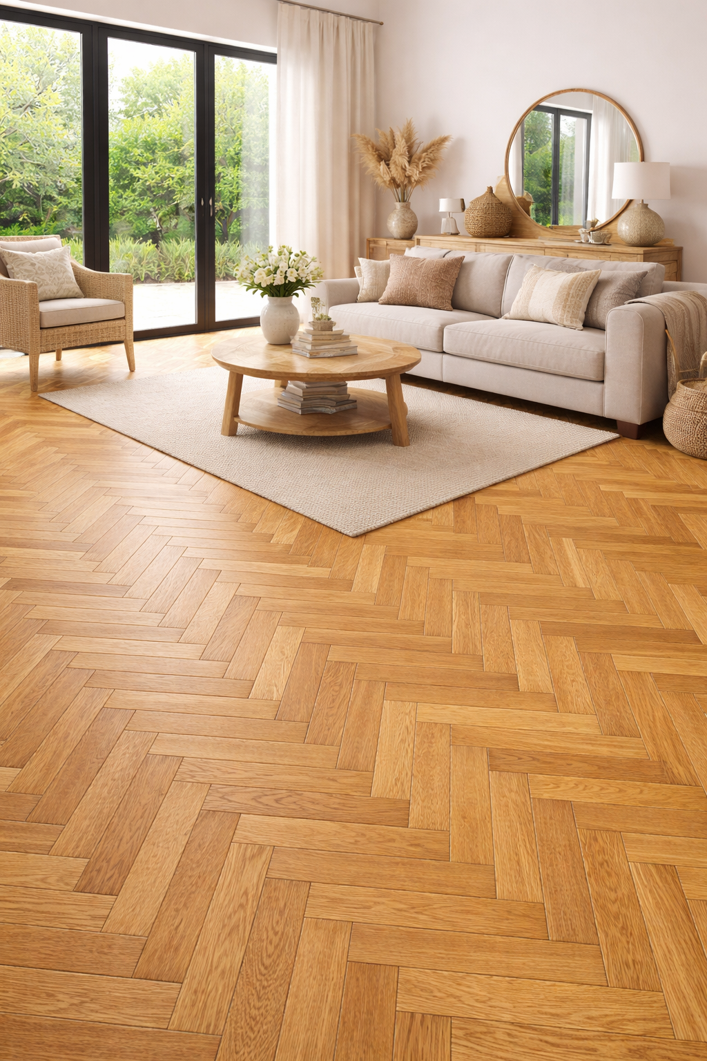 A premium 20mm herringbone engineered oak floor with a warm golden tone, brushed texture and UV oiled finish for a natural, timeless look.
