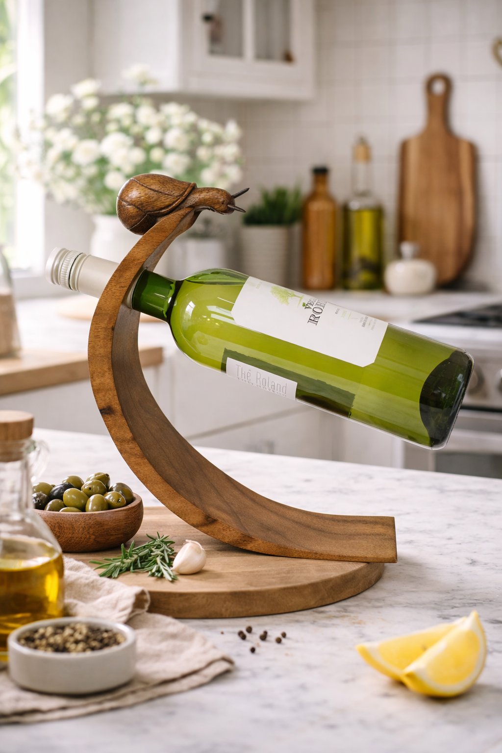 Add character and craftsmanship to your kitchen or dining space with this wooden balancing wine holder, featuring a hand-carved snail design. Expertly crafted in Indonesia from a single block of high-quality Suar wood, this distinctive holder is carefully shaped to balance a full bottle of wine with ease—no moving parts, just clever design and solid craftsmanship.