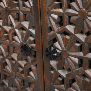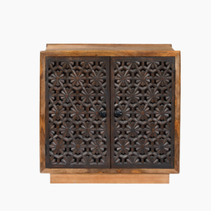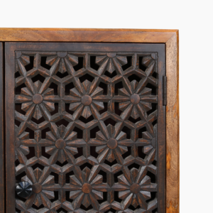 The cabinet’s two spacious compartments are hidden behind intricately carved grey-toned floral cut-out doors, complete with rustic metal accents for an authentic artisan touch. Ideal for storing clothes, linens, or everyday essentials, the Zaayah cabinet helps keep your space neat without compromising on style.